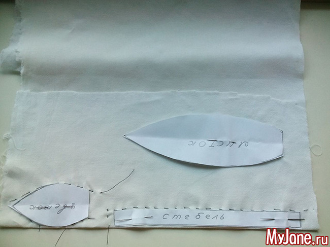 Вырезаем каждую деталь, мы их повторим в трех экземплярах, сделаем три цветка. Стебель и листочки будут – зеленого цвета, а бутоны можно разнообразить разными кусочками ткани.