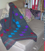 Основой этого пледа послужил трикотажный джемпер, разрезанный на треугольные кусочки различного размера и формы. Для обвязки лоскутов и заполнения промежутков использованы тонкие малиновые и черные нити в различных цветовых вариантах сложения. Финальная отделка – ажурная кайма по коротким сторонам изделия.