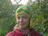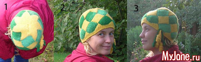 Во втором ярусе (схема 2) использована зеленая нить секционного крашения, углы ромбиков (для получения конической формы шапочки) менее острые. Для этого прибавления в начале ряда и убавления в конце выполняются во 2-м, 4-м, 6-м и 8-м рядах (схема 2, элементы 2.1-2.7). Для прибавления 1 петли – после кромочной вытянута нить из горизонтальной закрепляющей петли, для убавления – пропустить при наборе последнюю вертикальную петлю предыдущего ряда. При закрытии петель во всех рядах две (вытянутая из края желтого ромба и вытянутая из краевой петли ряда) провязать вместе. Следующий, третий ярус, из прямоугольных желтых элементов, начинается с 12 петель и заканчивается 12, без прибавлений в начале наборного ряда и убавлений в конце. В четвертом ярусе – зеленые элементы, каждый из которых начинается с 12 петель 1-го ряда и заканчивается срезанным уголком. В 4-м ярусе общая высота шапочки достигла 20 см, уголки прямоугольников убраны с помощью убавлений в 5-8 рядах. Пятый ярус – желтые уголки, из 4-х рядов уменьшающейся длины, фото 2.