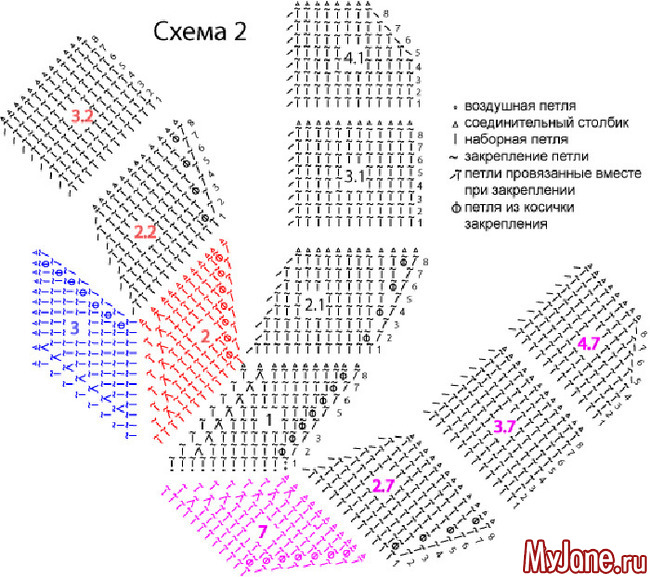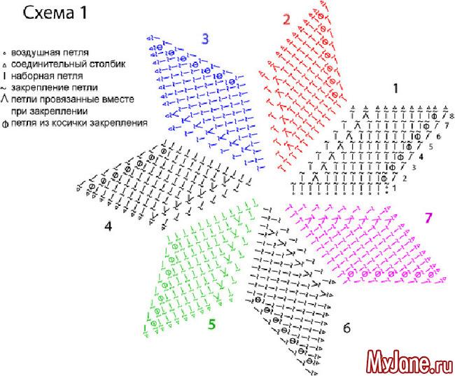 Первый ромбик донышка вязать на 12 ВП, в последующих (2-8) рядах выполнять прибавление в начале ряда и убавление в конце. Петли для второго ромбика набирать по наклонному краю первого ромбика, остальные ряды такие же, как в предыдущем элементе. Довязать еще 5 ромбиков донышка. Пришить наклонный край седьмого элемента к наборной цепочке первого.