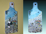 Итак, после нанесения белой краски-основы на поверхность доски в два слоя, прикладываем нужный фрагмент салфетки. И начинаем работать в технике декупаж. Смоченной в клее с водой кистью аккуратно расправляем рисунок от центра к краям. Выдавливаем пузырьки воздуха и устраняем погрешности мягкой тряпочкой, слегка прижимая ее по всей поверхности салфетки, также работая от центра. Здесь нужно максимальная аккуратность, чтоб не повредить бумажную поверхность, она очень тонкая. Ждем высыхания, покрываем слоем клея ПВА уже без воды. Рисунок закрепился.