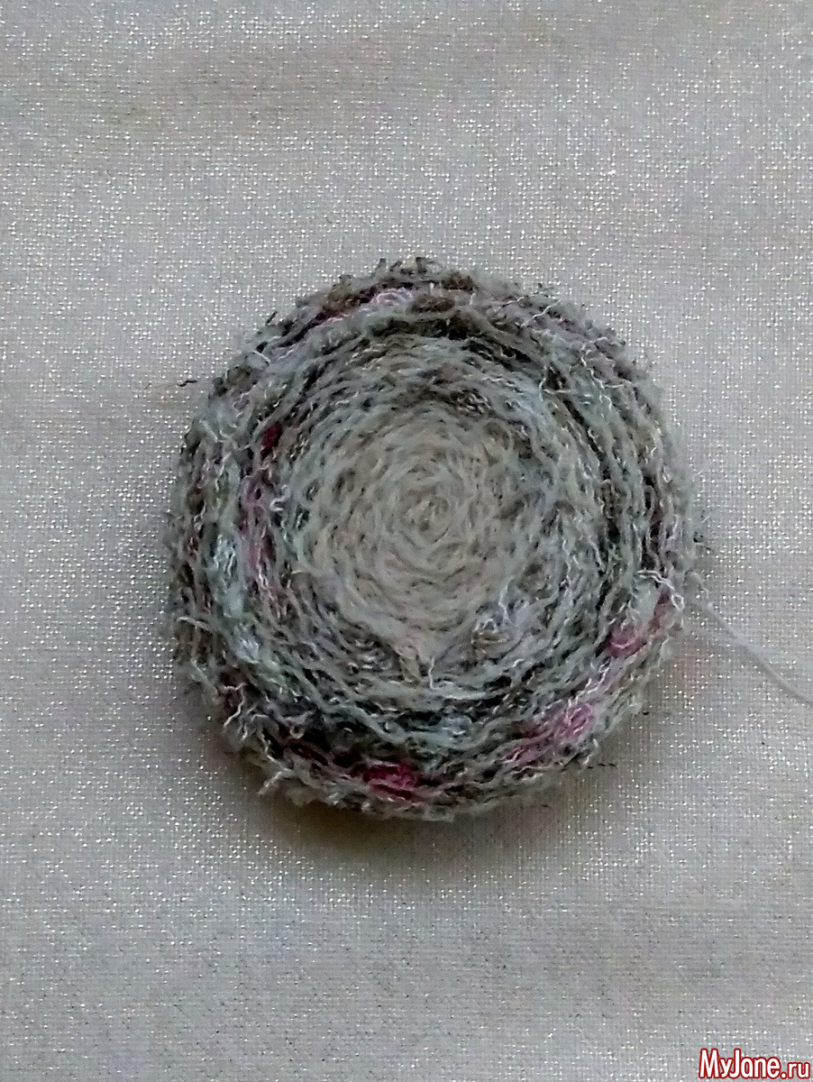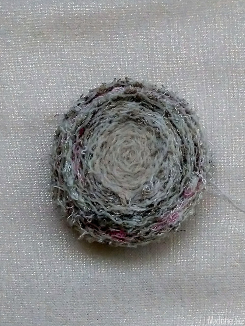 1. Формируем серединку броши из длинной полоски ткани. Для этого ткань складываем вдоль длинного края и плотно сворачиваем кругляшок. Фиксируем нитками или клеем. Я взяла для серединки броши кусочек вискозной ткани, причем, не отрезала её ножницами, а оторвала полоску, благодаря чему получился слегка растрепанный, но не сыпучий и ровный край.
