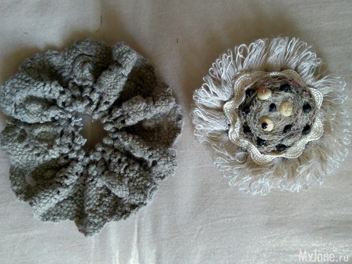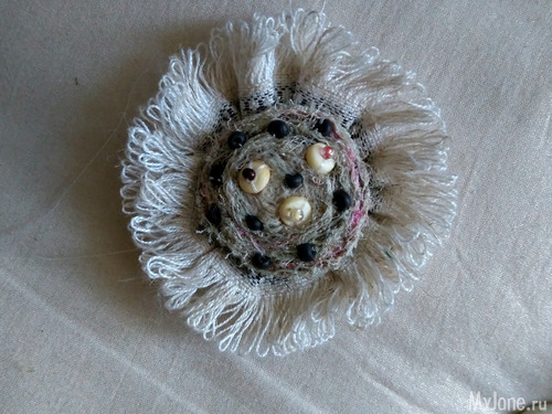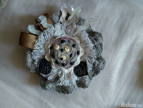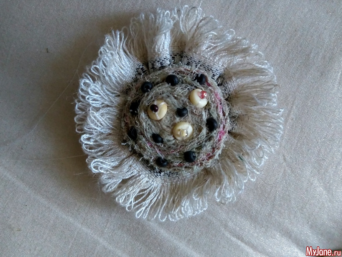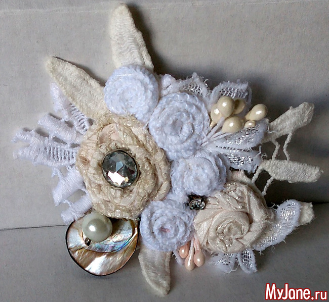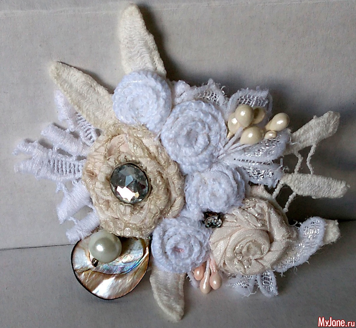 А вот эта брошь в молочно-белых оттенках сочинилась попутно из обрезков ткани, кружева и бусин.