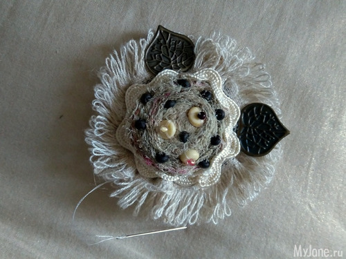 4. Место соединения серединки броши и тесьмы закроем тесьмой-вьюнком молочного цвета, пришив незаметными стежками. Под вьюнком также прикрепляем при помощи ниток два листика.