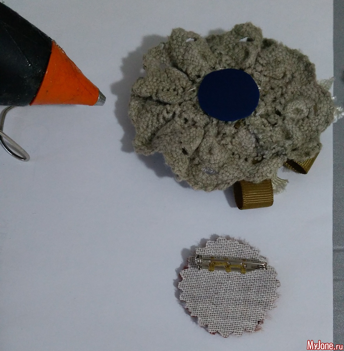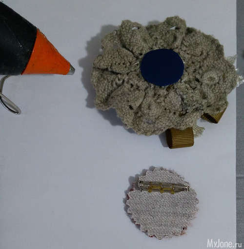 10. Крепим застежку к основе из плотной ткани и приклеиваем к броши. Для уплотнения можно приклеить кружок из пластика (вырезать из любой упаковки от геля или шампуня).