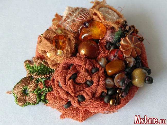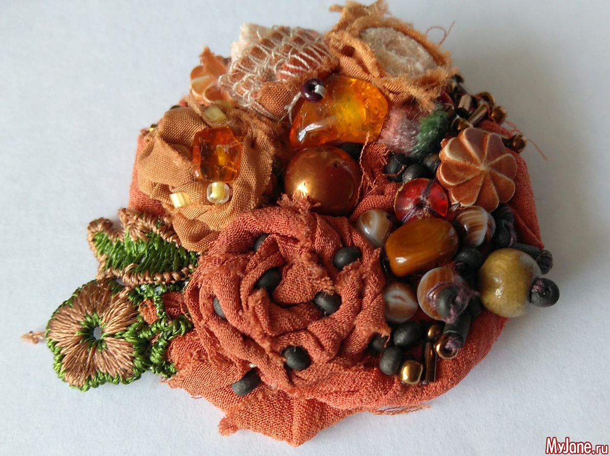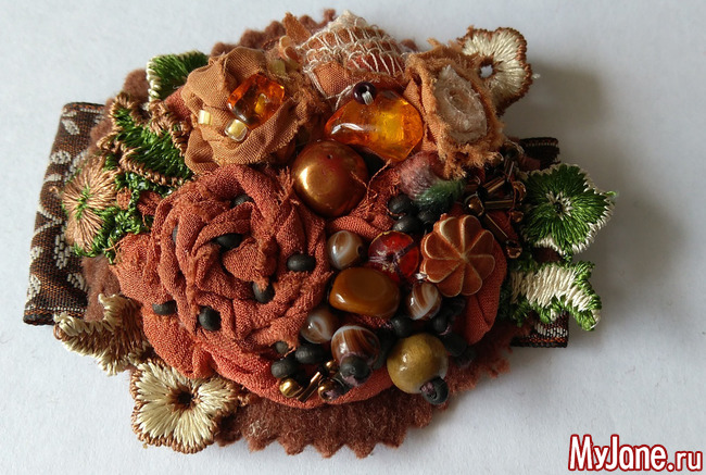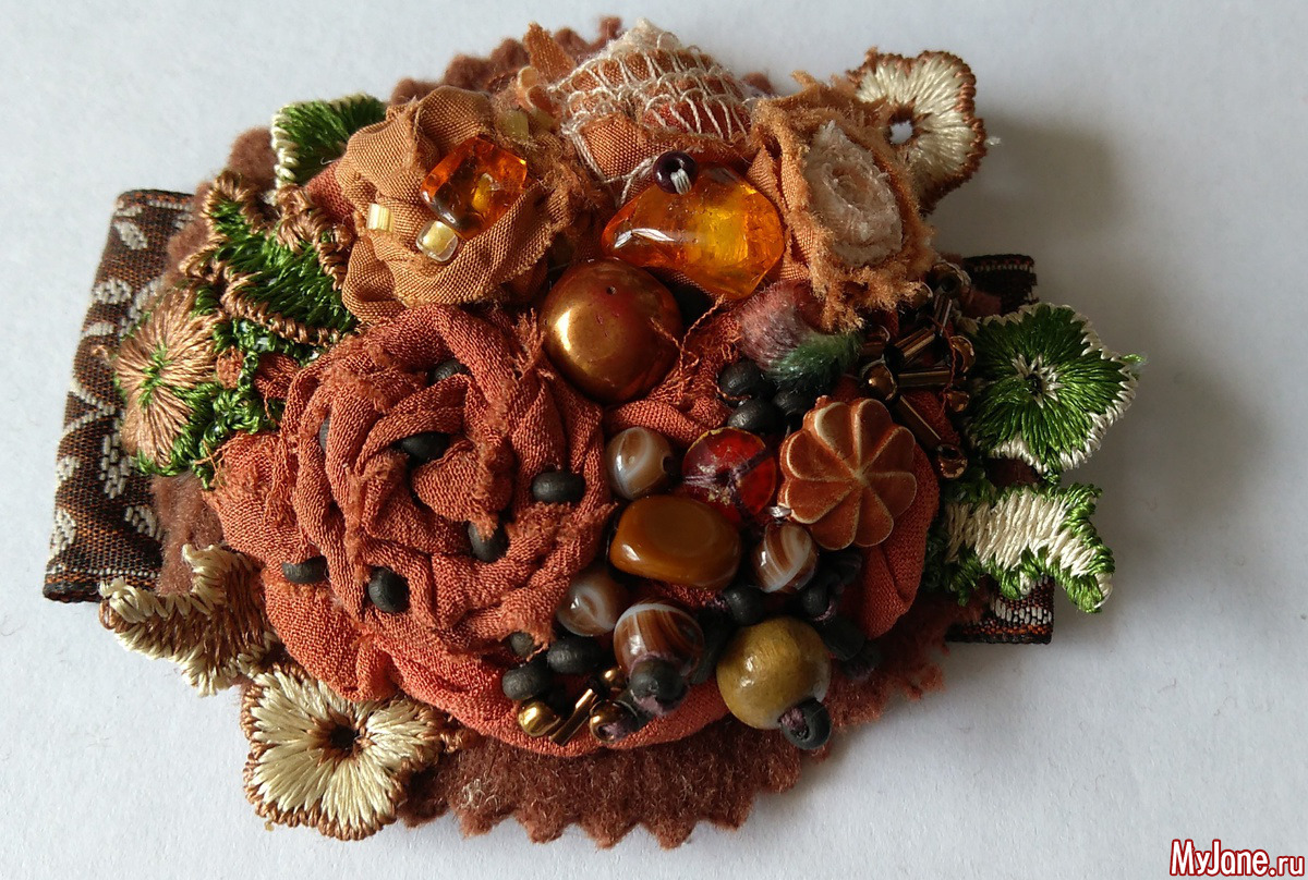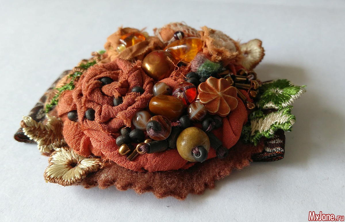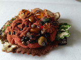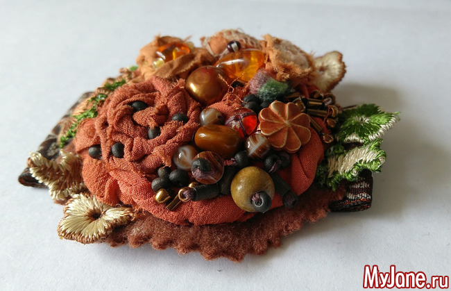 Имя этой броши пришло само собой, в процессе рождения. Примерно также, как и при приготовлении пиццы, здесь есть основа (вместо теста) и ворох начинки сверху – все, что нашлось в закромах. Главное – сочетание «вкусовых особенностей» - цвета, фактуры, материалов. В данном случае – натуральность и приглушенность оттенков.