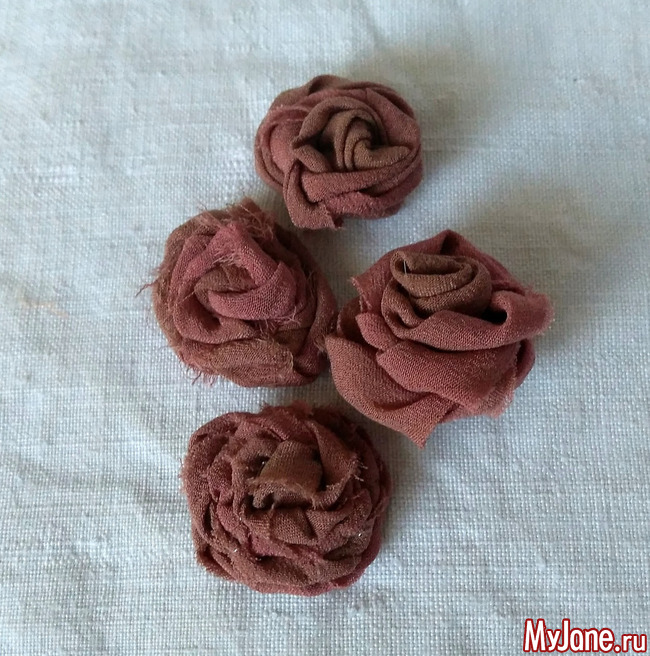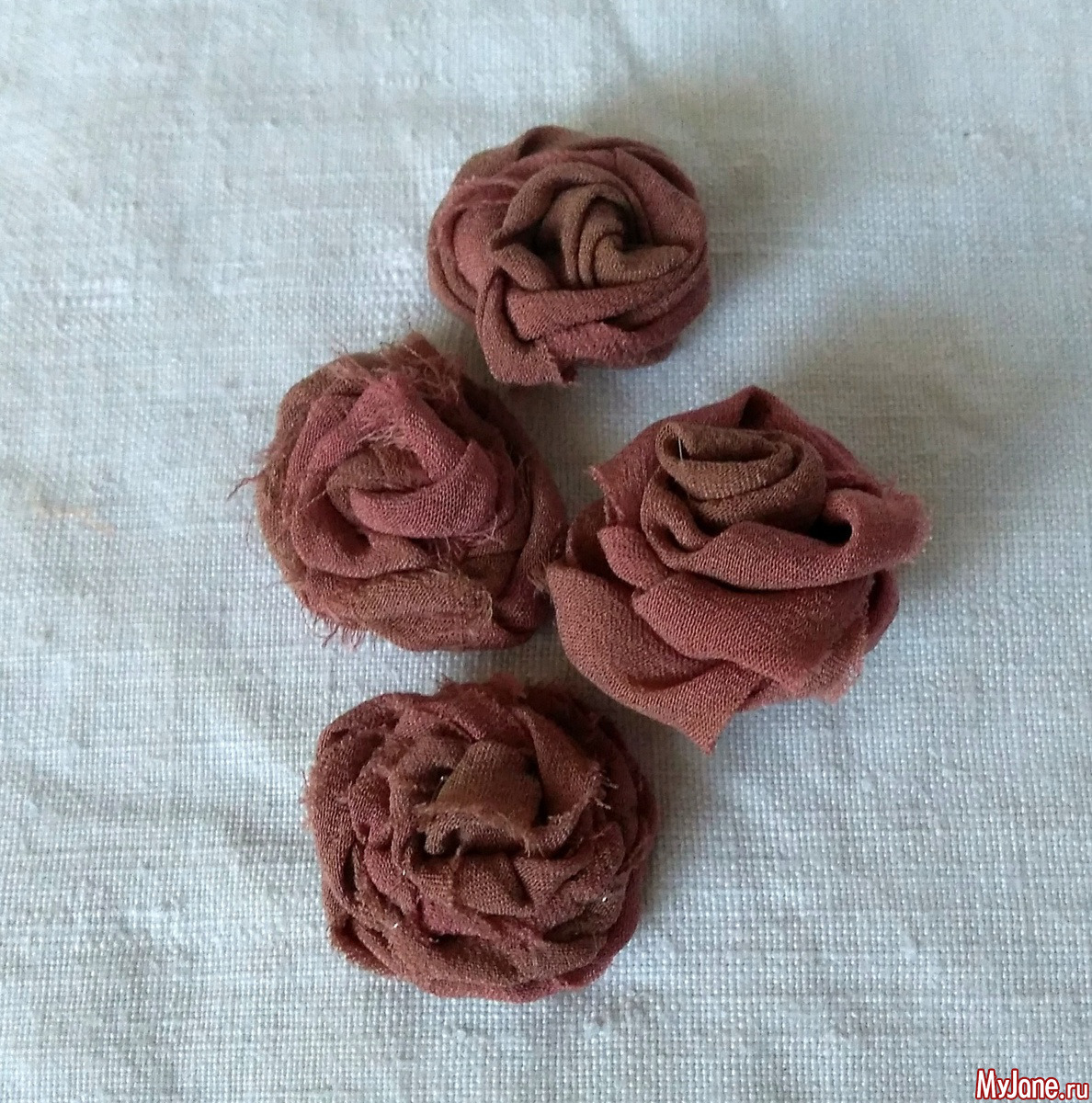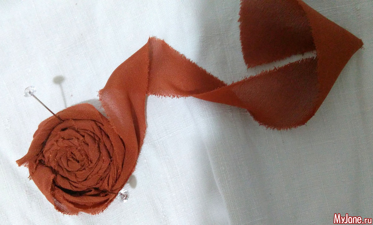 3. Аналогично маленьким розочкам скручиваем из длинной полоски шифона кирпичного цвета