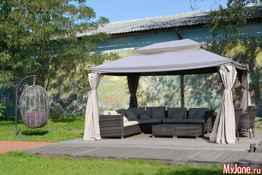 Оптимальный вариант для крытой площадки – шторы из ПВХ. Помимо красоты они несут «нагрузку» в виде защиты внутреннего пространства от дождя, сквозняка, насекомых. Варианты из ткани тоже имеют место быть, но они быстро загрязняются, да и пропускают капли, порывы ветра.