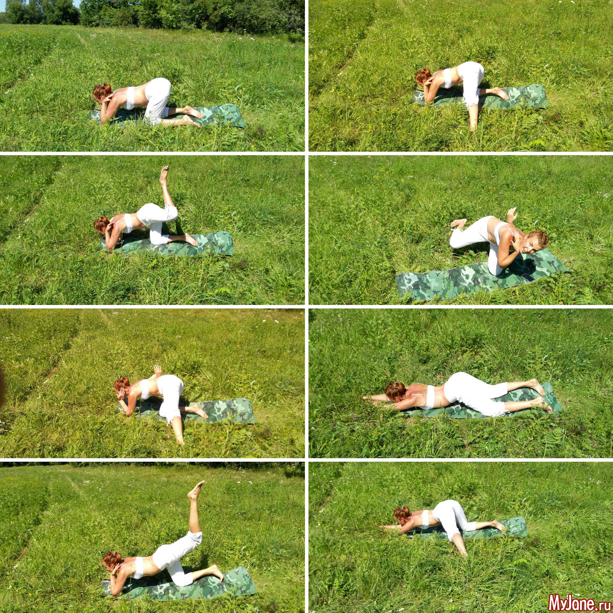 Вернитесь в исходное положение упражнений Верхнего мира, наклоните корпус вперед, прогнитесь в пояснице. Поднимитесь на носочки, затем опуститесь с них.Упражнения Среднего мира выполняются, стоя на коленях, руки согните в локтях, ладони соедините внешней стороной за спиной в районе поясницы.