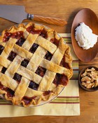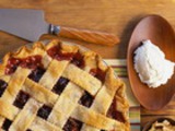 Слой теста раскатать и уложить на противень. Намазать повидлом или джемом. Сверху уложить вишни отверстиями вниз. Посыпать начинку толчеными сухариками. Оставшееся тесто раскатать в пласт и нарезать из него «ленточки», которые укладываются поверх пирога в виде решетки. Защипать нижний слой пирога, закрепляя с решеткой. Пирог должен немного постоять для поднятия. Смазать его яйцом и выпекать при средней температуре.