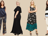 Прямые брюки, немного расклешенные книзу — отличный вариант для полной фигуры. Здесь они сшиты из темно-синей ткани с цветами и дополнены атласным топом в той же гамме. Все вместе создает стильный, женственный комплект.Кстати, атлас сейчас находится на первых позициях среди модных материалов.
