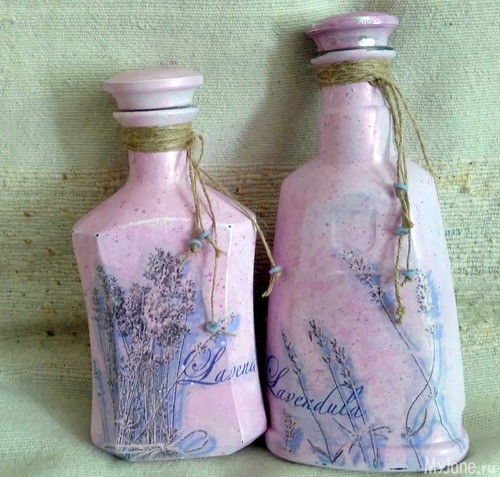 На следующем этапе тонируем бутылки колером цвета лаванды. Я не ставила перед собой цель закрасить фон сплошным слоем, хотелось получить более сложную фактуру. На тарелочку (палитру) наносим немного белой краски и рядом -немного колера, губкой набираем краску вперемешку с колером и хаотично наносим на поверхность бутылки. При желании можно усилить эффект приемом набрызга: наносим немного колера на щетину кисти или зубной щетки, проводим по щетине пальцем, направляя брызги на бутылку. После высыхания краски наносим слой жемчужной эмали. Сушим.