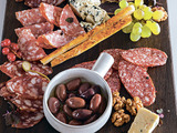 Не смешиваем! Все виды колбасных и мясных нарезок подают на стол на отдельной тарелке, не создавая соседства с другими продуктами – сырами, фруктами и т.д. Также не советуем украшать нарезки зеленью и салатом: всё это быстро завянет и будет уже не украшать, а совсем наоборот. Если дизайн сервировки нарезки предполагает наличие ярких акцентов из других продуктов (оливок, перчиков и т.п.), поместите их в небольшие красивые ёмкости и поставьте на блюдо с нарезками.