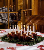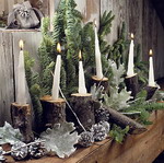 Композиции с природным материаломДля следующей композиции, выглядящей очень по-новогоднему, вам понадобится природный материал – еловые ветки, шишки, деревянные пеньки. На деревянные пеньки разной высоты прикрепите свечи, накапав предварительно расплавленного воска. Но композиция будет выглядеть лучше, если в пеньках предварительно просверлить небольшие отверстия по диаметру свечей и вставить свечи в них.