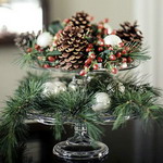 На заднем плане разместите еловые ветки, а на переднем – шишки.Но если у вас имеется лишь нескольких еловых веточек и пара шишек, то лучше всего разместить их в красивой вазочке. Идеально подходят для этого «многоэтажные» вазочки для фруктов.