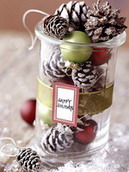 И снова ничего не может быть проще: подберите несколько разных по цвету и размеру елочных украшений, положите их в большой стеклянный бокал или любую прозрачную вазу. Можно дополнить елочные игрушки свечой или шишками.
