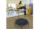 Также ручка батутной станции является опорой для выполнения упражнений на растяжку. Например, приняв упор руками на ручку батута, а стопы разместив на краю станции, можно наклониться вперед до параллели корпуса с полом и потянуть таким образом спину и позвоночник. Такое упражнение подойдет для перерыва между мощными кардио-блоками, которые собой представляют прыжки на батуте.