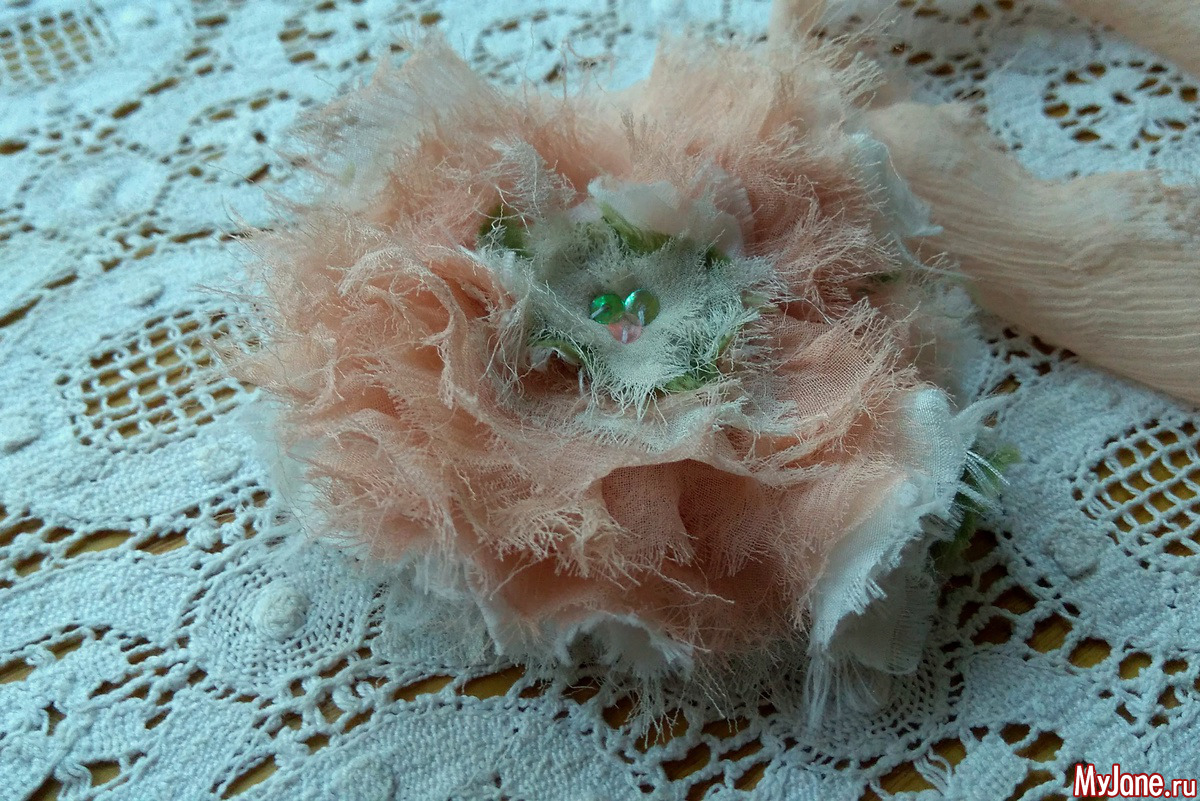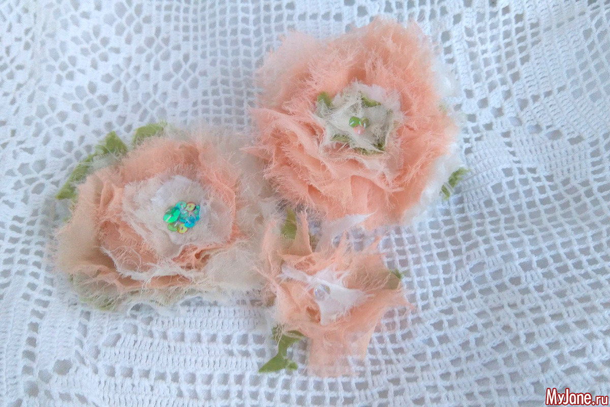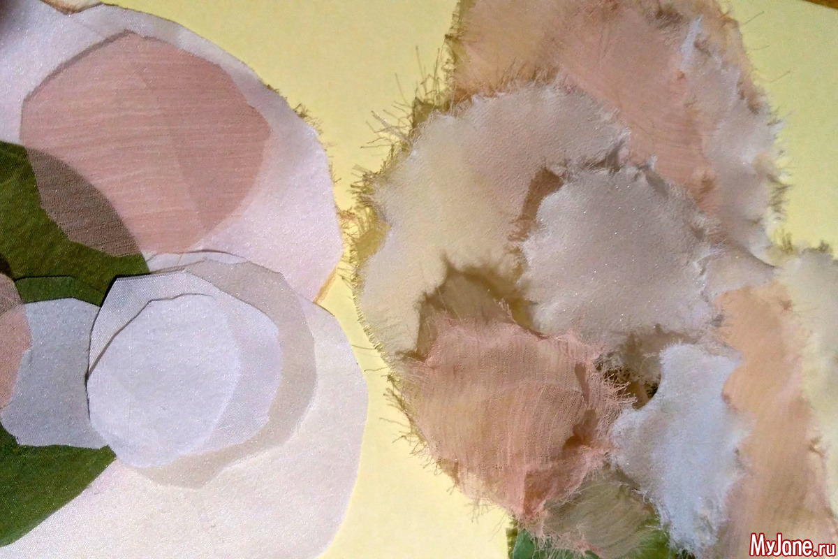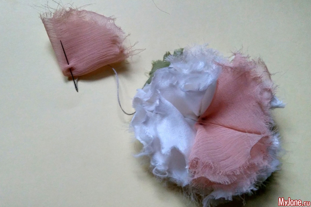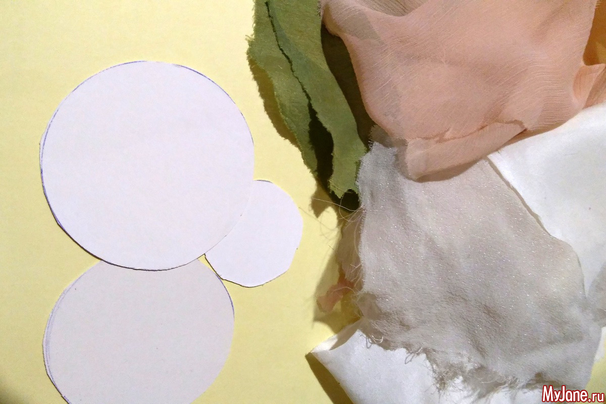 Из тонких тканей не очень просто вырезать ровные круги, но нам это не столь важно, ведь все срезы нужно слегка вытрепать пальцами, придав некую небрежность и воздушность одновременно.
