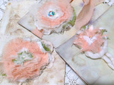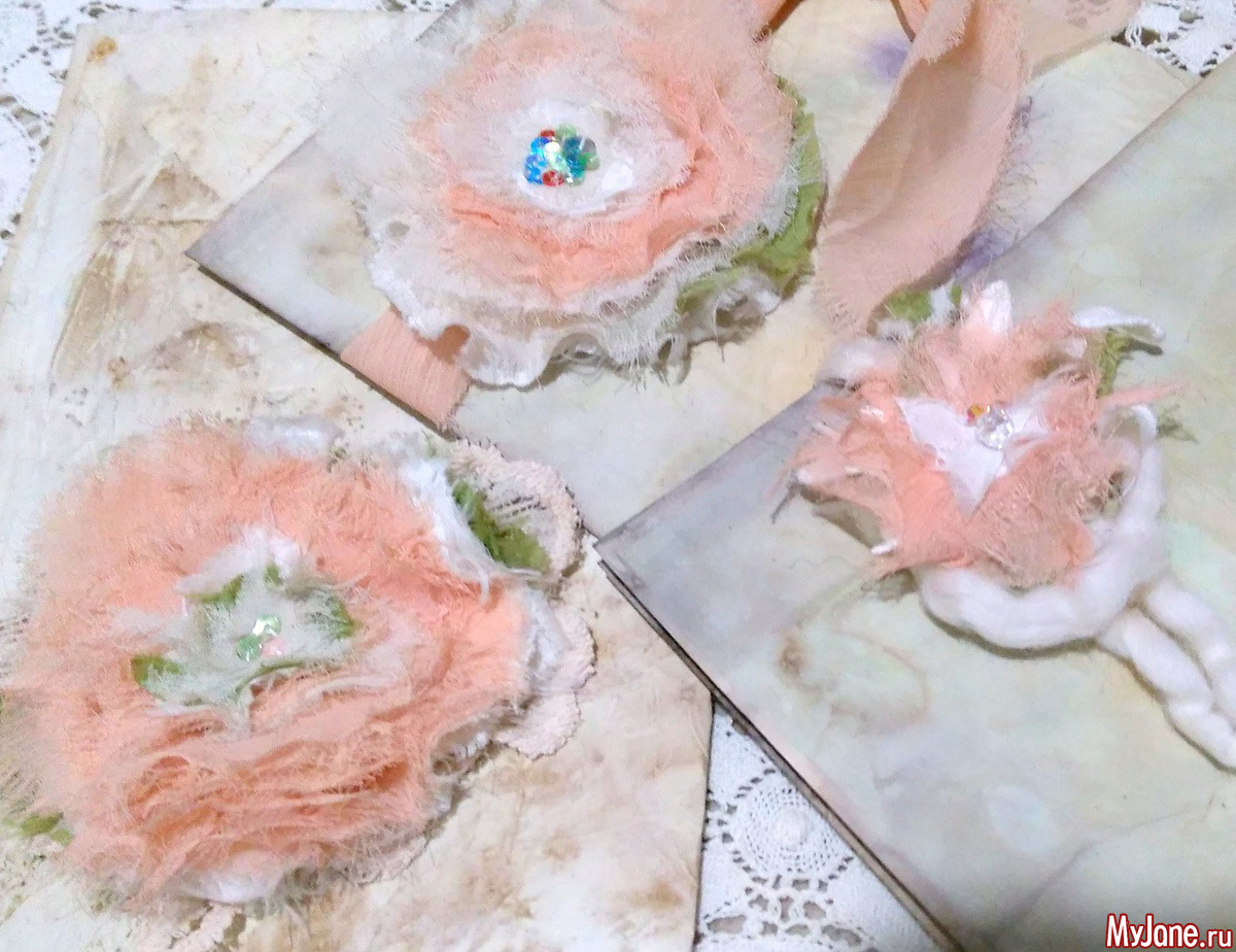 Для трех украшений нам понадобятся лоскуты легких шелковых тканей нежных оттенков, небольшой отрезок толстой шерстяной пряжи, несколько фрагментов натурального кружева, чуточку пайеток и бусин, булавка для застежки.