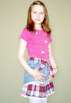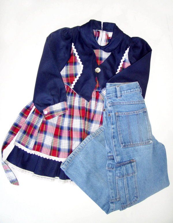 Из джинсов и платья, которые стали малы вашей дочери, можно сшить модную юбку.