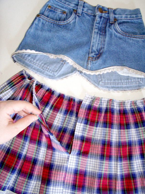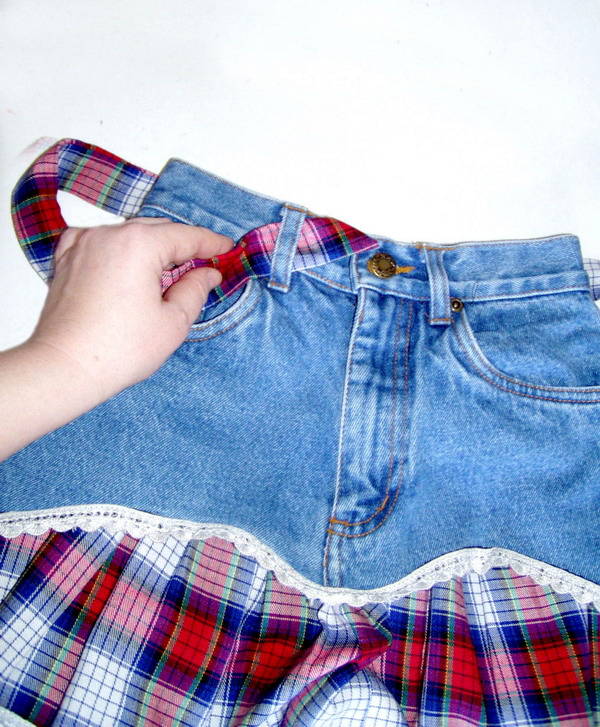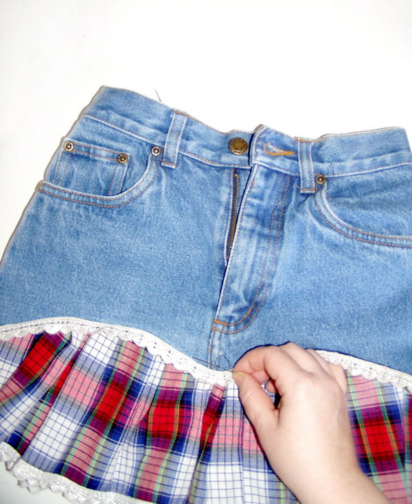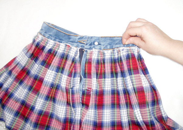 Вложите юбку в джинсы и пришейте ее около пояса. Разрез на юбке должен совпадать с застежкой на джинсах.