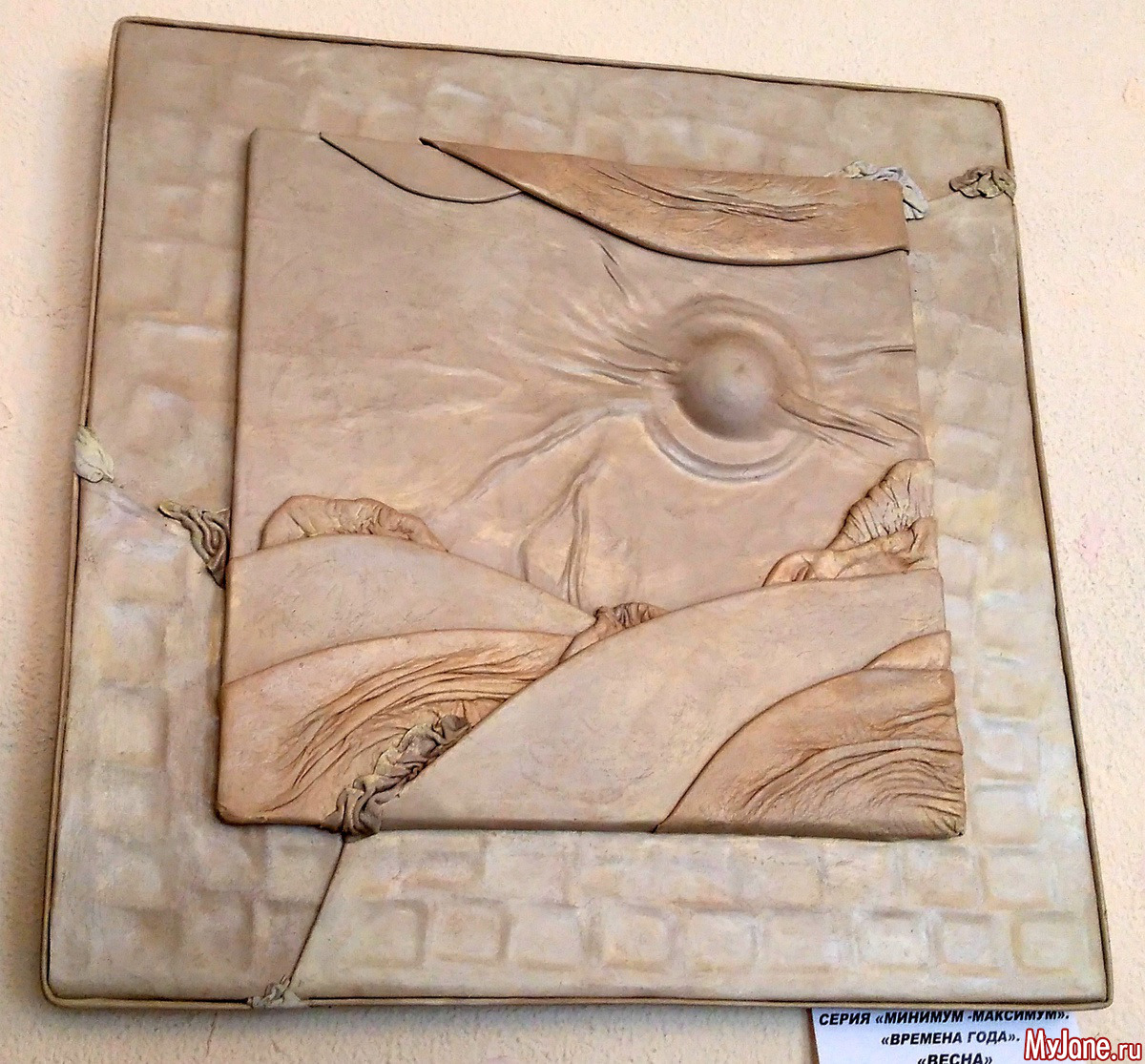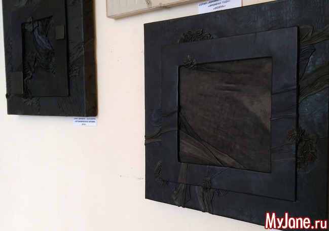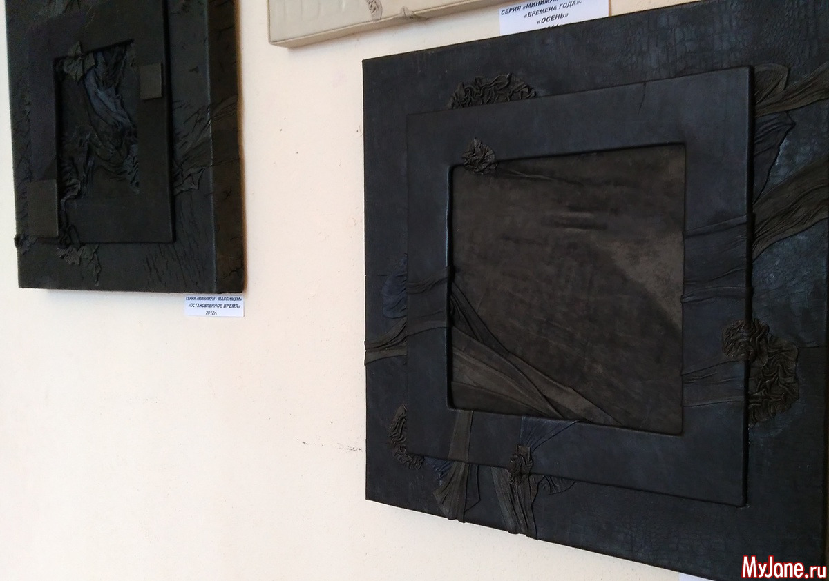 Многие из картин на выставке монохромны, в них нет буйства красок, лишь оттенки близких цветов разной насыщенности. А глубина и объем достигается при помощи эффектов, которые в обувном деле нещадно отбраковываются: потертостей, трещин, неравномерного окрашивания, деформации.