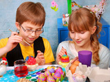 Блестящие яйца получатся, если использовать глитеры. Для этого надо сварить клейстер из кукурузного или картофельного крахмала и воды, покрыть им поверхность вареного яйца, посыпать блестками, поверх нанести еще один слой клейстера и оставить высыхать. Конечно, ребенку надо помочь.Детям будет интересно смешивать цвета на яйце и угадывать, какой цвет получится в итоге. Для этого белое яйцо опустить боком в стакан с краской и подержать минуту. Затем медленно выложить на салфетку сохнуть. После окунуть в другую краску яйцо другим боком, чтобы новый цвет немного перекрыл предыдущий. Так можно использовать шесть цветов, по очереди окрашивая разные стороны яйца.