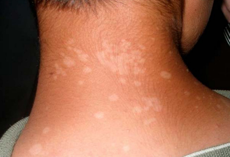 Отрубевидный или разноцветный лишай выглядит, как розовые шелушащиеся пятна с коричневым оттенком. Появляется этот лишай чаще всего на голове, спине, шее, руках. При этом лишае нет воспалительных процессов. Но если его не лечить, то пятна сольются и приобретут коричневый цвет. Этот лишай бывает и у детей и у взрослых.