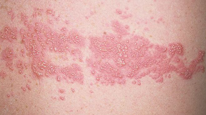 Выглядит этот лишай как пятна с пузырчатыми высыпаниями на них.