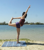 На выдохе наклонитесь вправо, растяните левую половину туловища. На вдохе вернитесь в исходное положение. На следующем выдохе аналогичным образом наклонитесь влево. Для большей эффективности возьмите в руки йогабол.