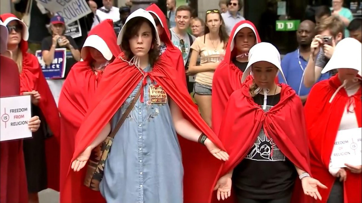 Более того, образ женщины в красном плаще и белом головном уборе – униформа касты фертильных женщин из сериала «Рассказ служанки» - теперь во всем мире примеряют на себя активистки, борющиеся за права женщин. Так, на марш протеста в подобных нарядах с отсылкой на роман и подавление своих прав уже выходили протестующие в Буэнос-Айресе, выступая тем самым в поддержку законопроекта о легализации абортов в своей стране. Не единожды наряжались служанками во время своих акций активистки ассоциации сторонников права на аборт NARAL в Техасе. Аналогичные протесты прошли в Белфасте и Дублине. В Хорватии активистки в костюмах служанок выразили протест Загребу в том, что там не была ратифицирована Стамбульская конвенция о защите женщин от домашнего насилия. Лондонские активистки нарядились в красные мантии в знак протеста визита американского президента Дональда Трампа в Великобританию.
