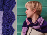 Для асимметричного шарфа/бактуса с длиной сторон 150, 125 и 63 см использовано около 300 г гладкой и буклированной (шерсть и акрил) пряжи 400-420 м/100 г различных оттенков сиреневого, спицы на леске 2,0, две чулочных спицы 2,0. Темные квадраты связаны узором с 4 листочками по схеме 1, светлые – узором с одним листом по схеме 2. По нижним сторонам этого шарфа привязана кайма с ажурными уголками по схеме 3.