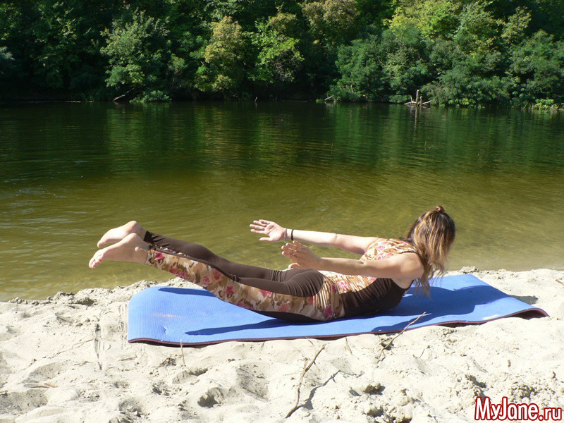 4. На выдохе поднимите над полом голову, грудь, ребра и тазовые кости, раскройте сердечный центр, удлиняя позвоночник и шею. Голову как можно дальше отведите назад.