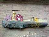 Использую акриловые краски, вернее, остатки оных (что было на даче). Домики высохли, чуть прошлась по ним наждачкой, тем самым получаю эффект состаривания.