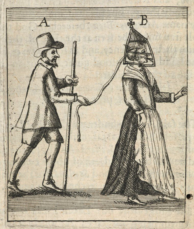 Муж, уличивший жену в измене, водил неверную по городу на поводке. Картина вызывала ужас у представительниц слабого пола и отбивала всяческую охоту к изменам. Представьте: мужчина ведет на поводке женщину в страшной позорной маске, при каждом шаге которой звенит колокольчик, привлекающий зевак, главное желание мужа - расправиться с неверной супругой, как только они останутся наедине.