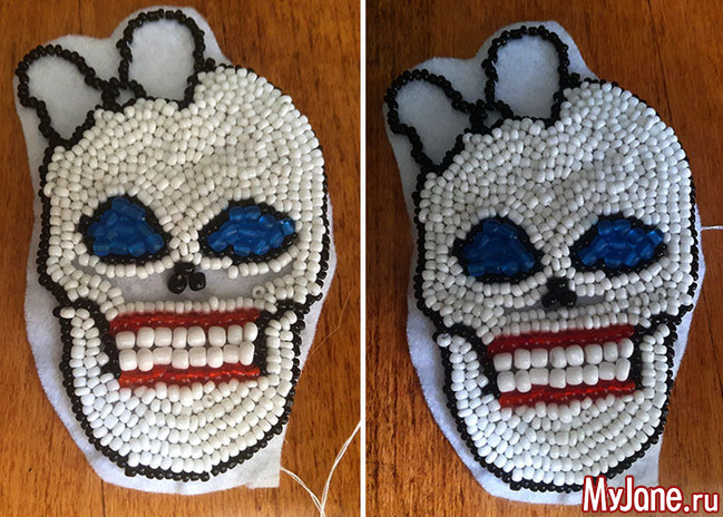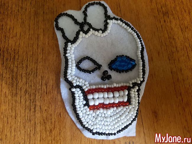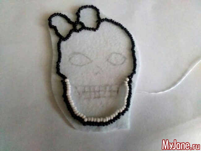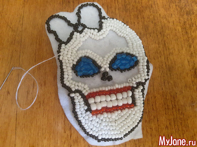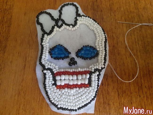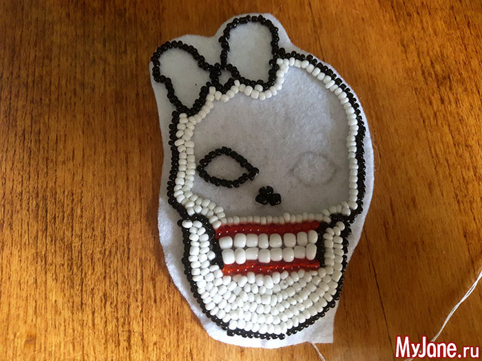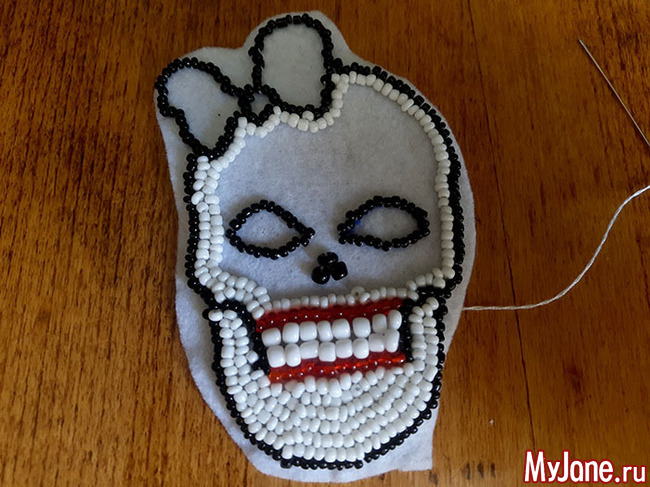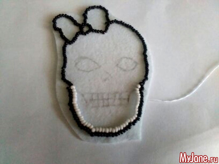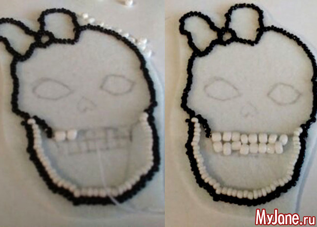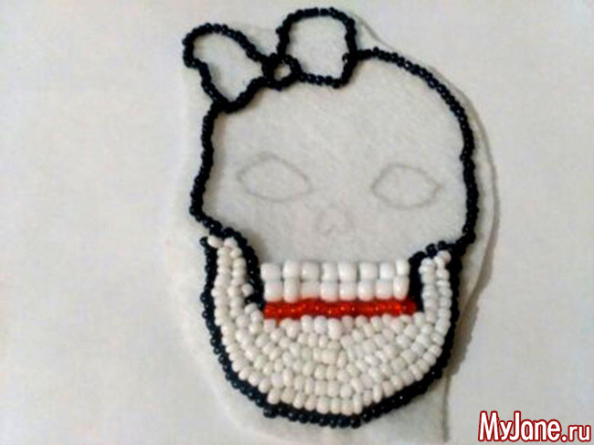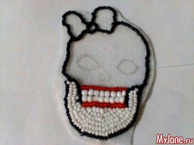Далее черным бисером вышиваем направление к улыбке. После, крупным белым бисером вышиваем зубы черепа.