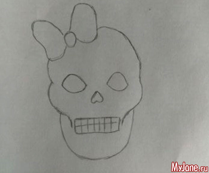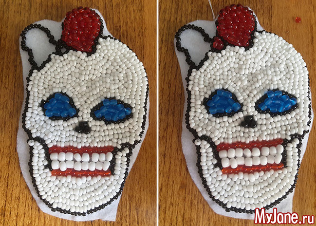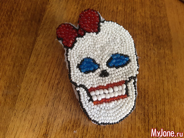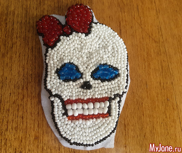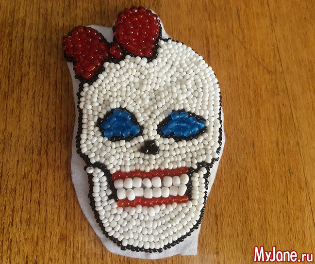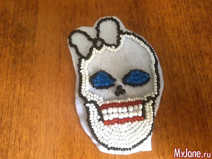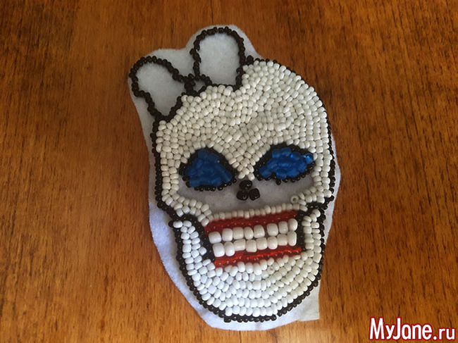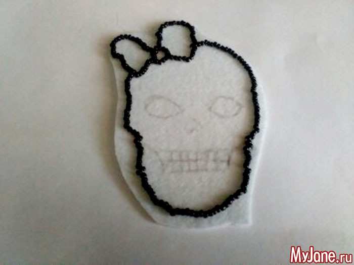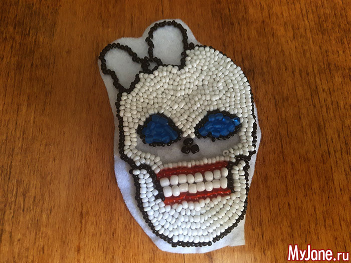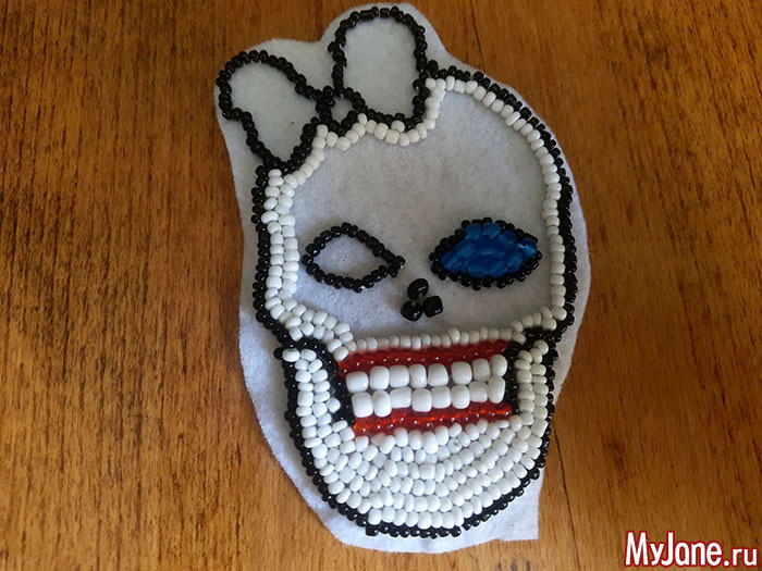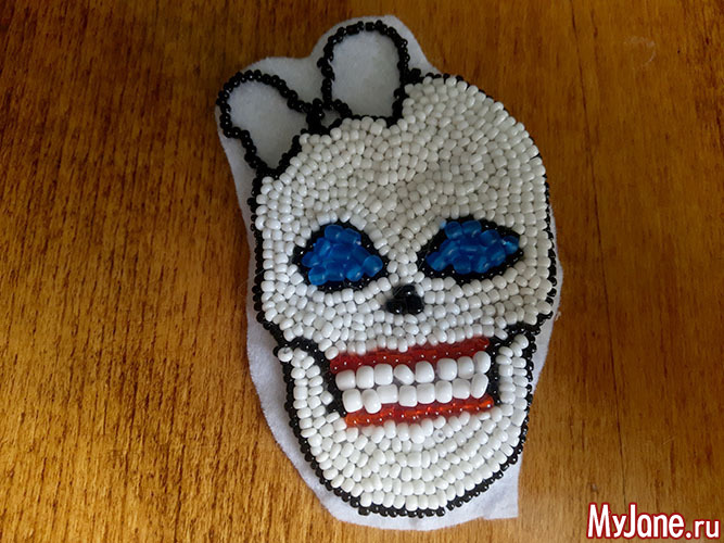 Далее черным бисером вышиваем направление к улыбке. После, крупным белым бисером вышиваем зубы черепа.