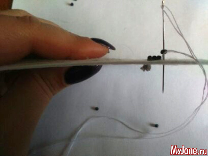 Приступаем к вышивке. В основном при работе с бисером вышивают крестиком, в этой работе решено было пойти другим путем. Вводим иголку перед предыдущей бисерникой на ширину следующей, далее продеваем бисер и вводим иголку назад, к предыдущей бисеринке. Таким образом получается что-то вроде техники иголка назад.