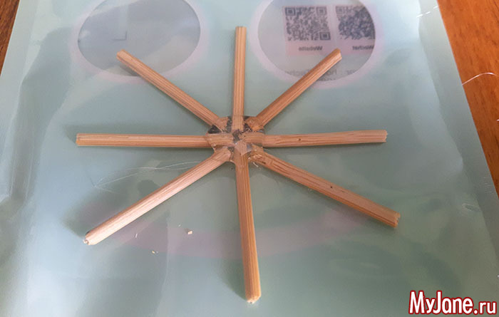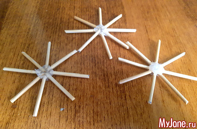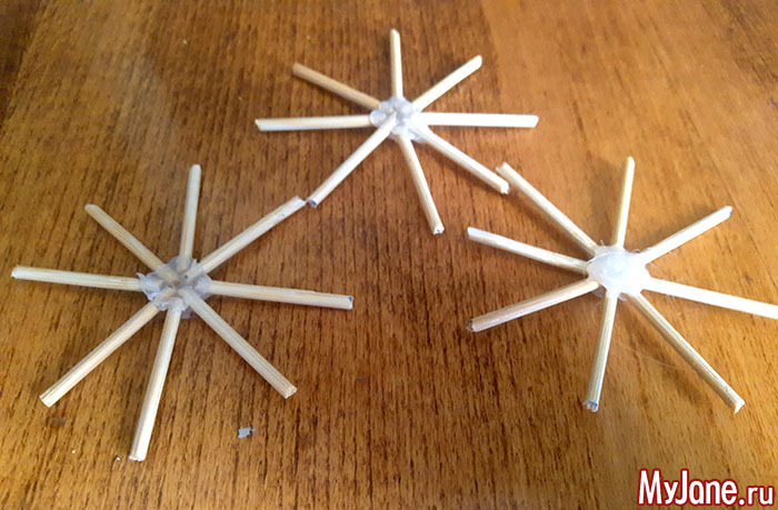 После чего от центра с разных сторон одной из спиц приклеиваем два отрезка длиной 9 см. На край коротких шпажек сверху и снизу приклеиваем отрезки длиной 3,5 см.