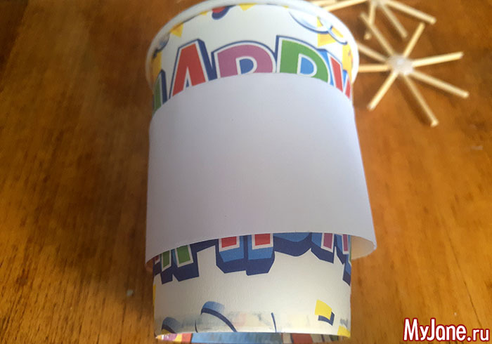 На середину стаканчика приклеиваем отрезок белой бумаги шириной 4 см.