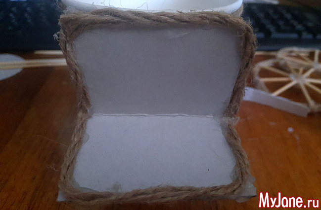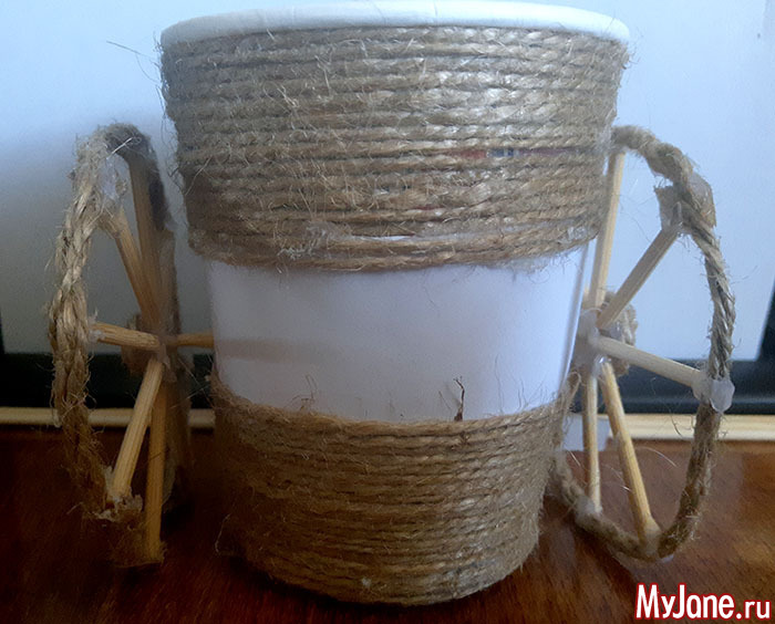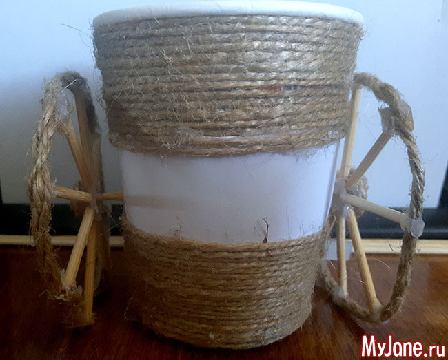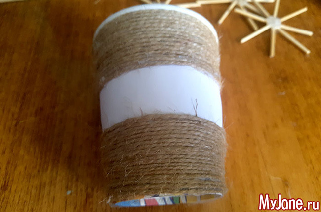 Верх и низ стаканчика обматываем бечевкой. Предварительно нужно зафиксировать края веревки.