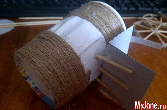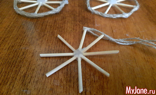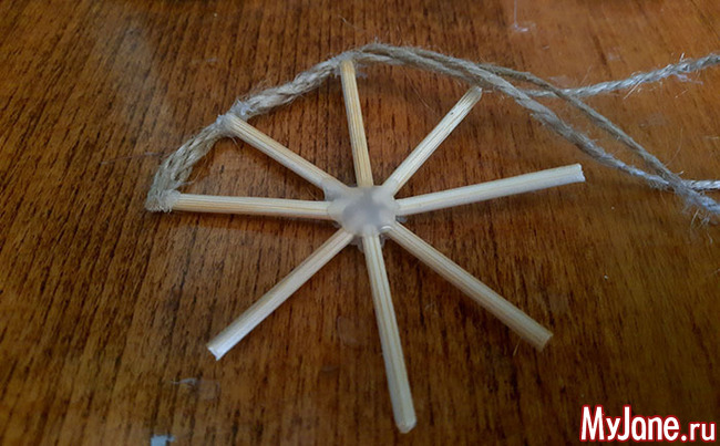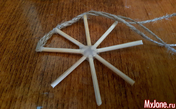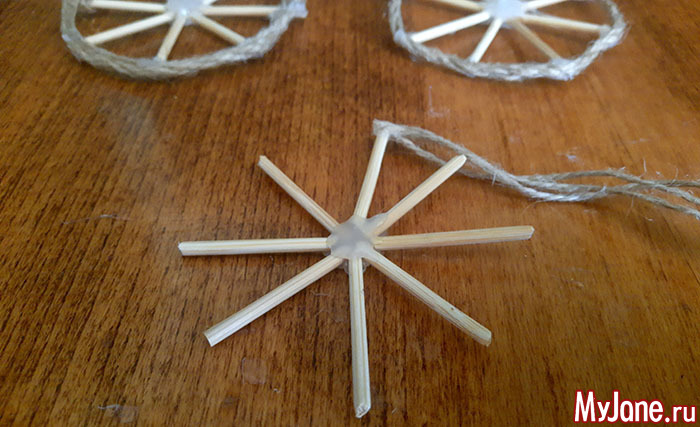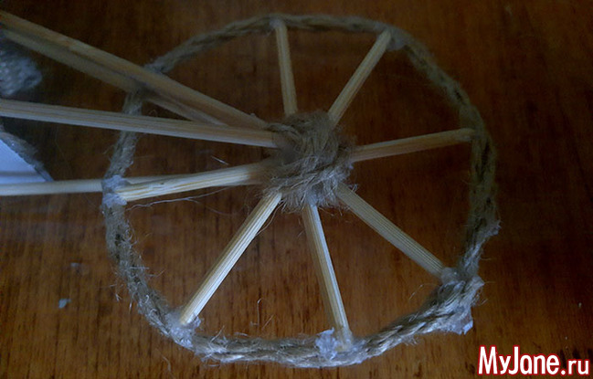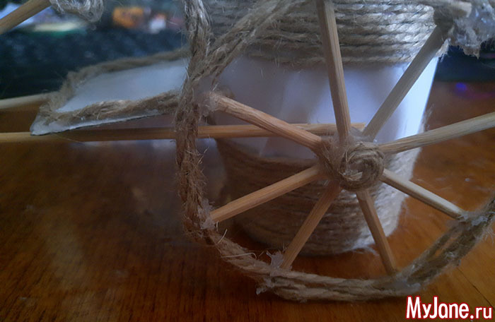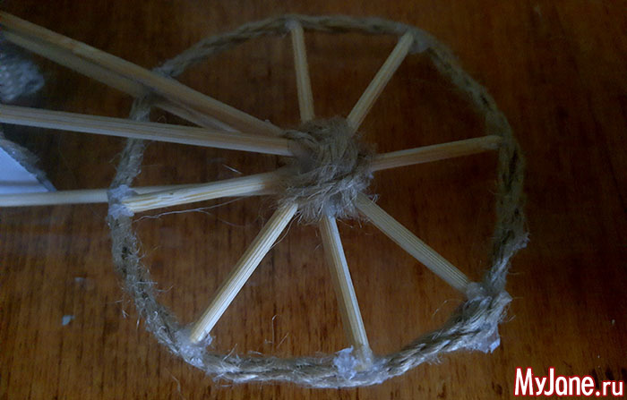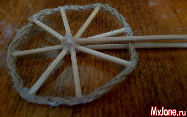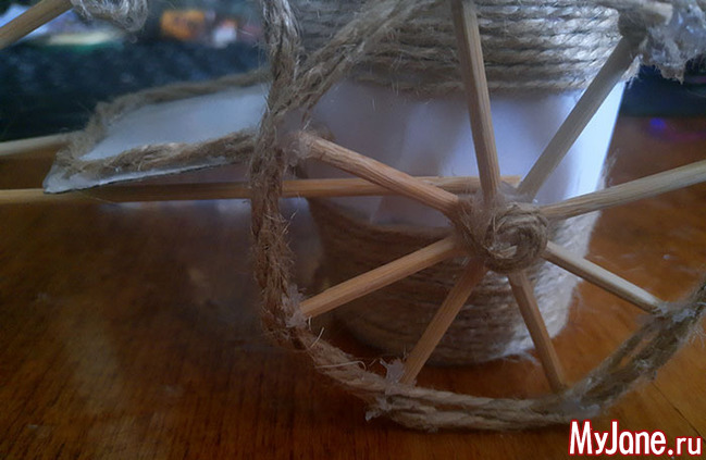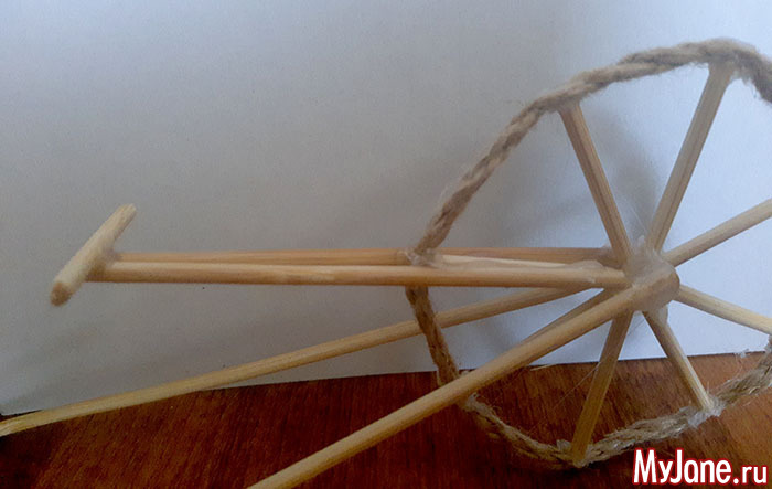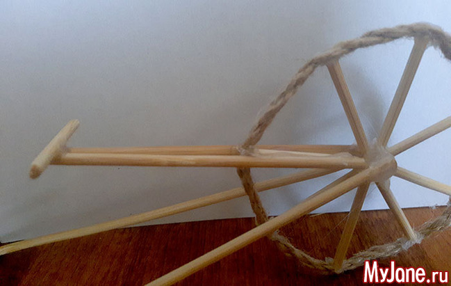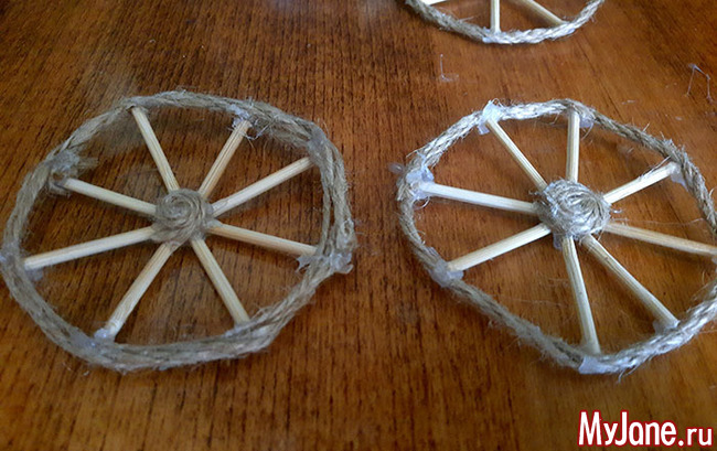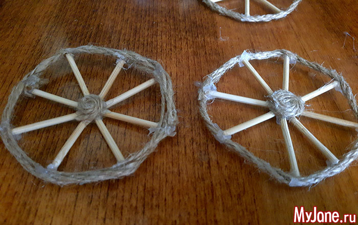 Переходим к колесам. Так как в этом случае бечевка тонкая, был использован отрезок, сложенный втрое. Фиксируем веревку на одной из шпажек, далее прокручиваем веревку жгутом и подклеиваем на каждую шпажку. Когда колесо готово приклеиваем веревку по кругу, закрывая клей по центру.