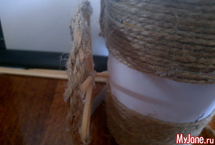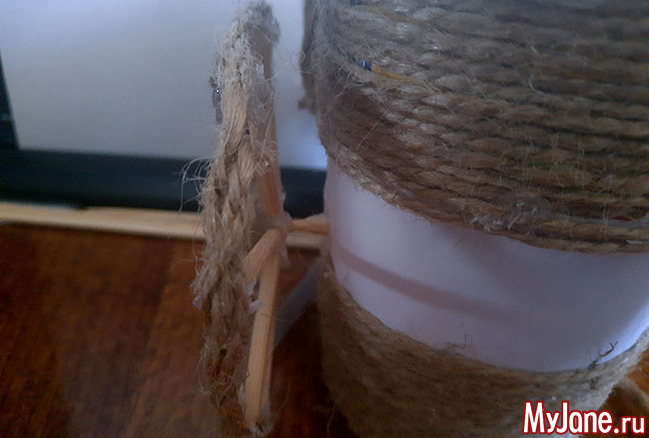 Обматываем бечевкой получившейся руль, фиксируем края веревки термоклеем.