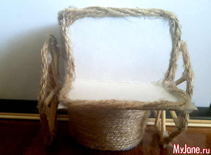 Приступаем к сиденью. Отрезаем три шпажки длиной 3,5 см. Слегка прокалываем стаканчик и фиксируем термоклеем. Вырезаем прямоугольник из белого картона, складываем пополам, одну сторону приклеиваем к шпажкам. Разгибаем картон и получаем сиденье. В качестве декора, сиденье также можно оклеить бечевкой.