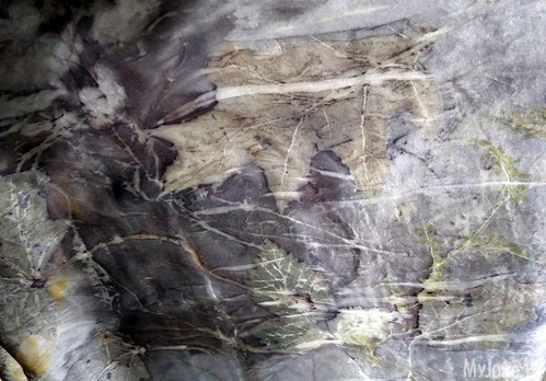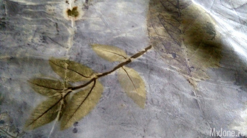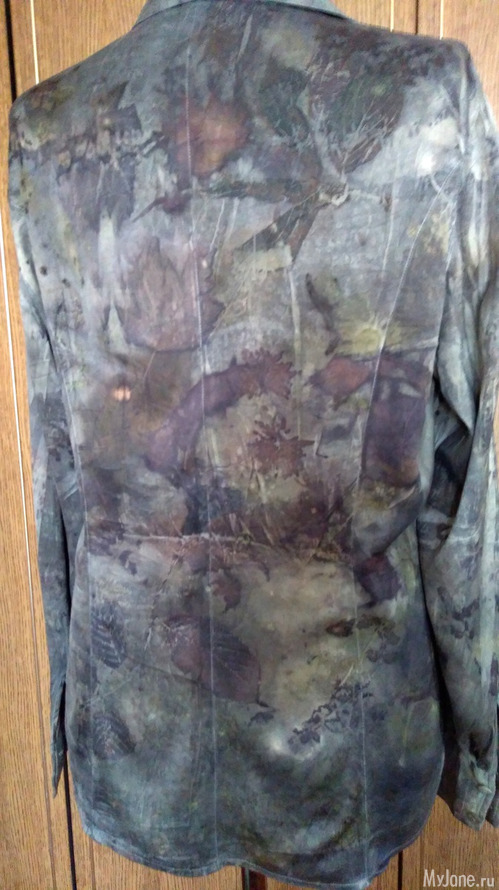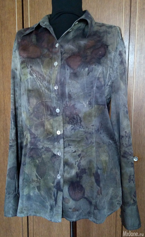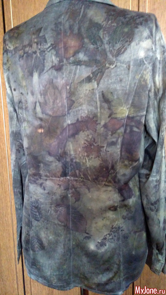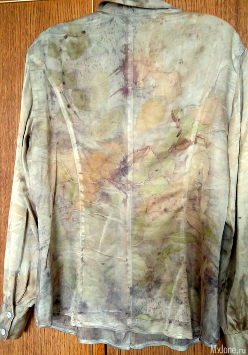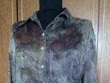 И еще одна рубашка из шелка-атласа,изначально была песочного цвета. Сначала я решила просто "разрисовать" её отпечатками листьев, но результат меня разочаровал - получились невнятные кляксы и контуры.