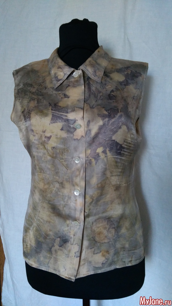 Итак, первый пример: блузка из шелка-атласа бежевого цвета, носила её много лет, но на рукавах появились дефекты... Поэтому я обрезала рукава и превратила блузку в летний вариант. В окраске участвовали различные листья, сначала блузку замочила в воде со столовым уксусом (1 ст. ложка на 1 л воды), отжала в полотенце, в качестве закрепителя - ржавая вода (листья были накрыты салфетками, смоченными в ржавой воде и хорошо отжатыми).