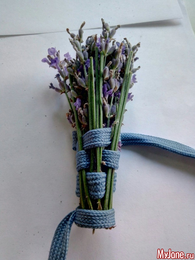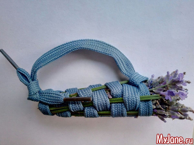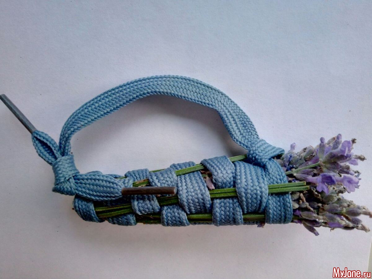 Для закрепления букетика можно использовать декоративную ленту, жгут, бечевку – что вам по душе. У меня с выбором на даче туго, нашла новые шнурки, использую их.