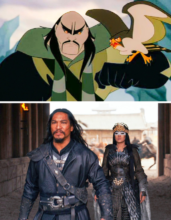 Главные антагонисты фильма позаимствованы из мультфильма. Это внутренние враги императора - Бори Хан, жаждущий захвата власти, и его помощница - Сянь Лан, все же тяготеющая на сторону добра и симпатизирующая впоследствии Мулан.
