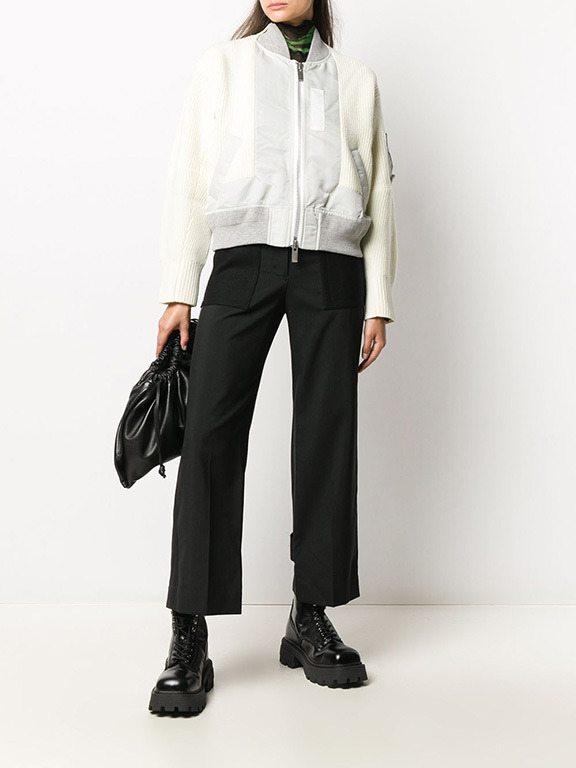 А эта белая куртка сочетает в себе три материала: трикотаж двух видов и плащевку.