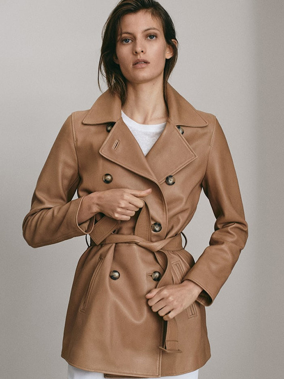 Двубортная кожаная крутка с поясом приятного песочного цвета. И снова обратите внимание на крупные черепаховые пуговицы.
